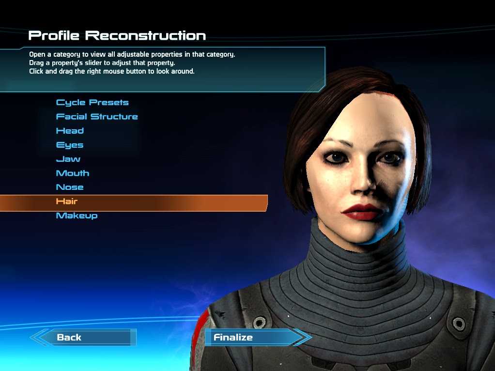 Coming straight off the heels of Perra, who also was from the slums, it would be easy to say that you see a trend in my character creation. That isn't really true though since I saw this as the better of three choices. "Spacer" was a past where both of Shepard's parent had been in the military. She would have grown up on ships and in stations, moving locations every couple of years, and then followed in her parent's footsteps at the age of eighteen. The other option "Colonist" was a history where Shepard would have been born in a small border colony that was attacked by slavers when she was sixteen. The slavers slaughtered her family and friends, and she was saved by an Alliance patrol. A couple of years later she enlisted.